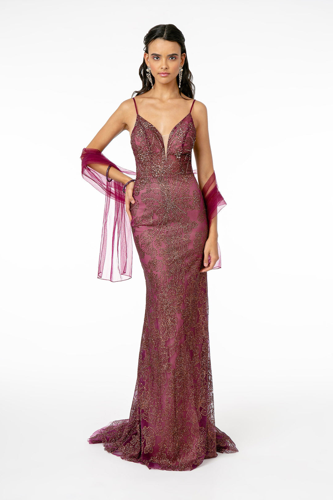 Jeweled Waist Band Accented Glitter Mesh Long Dress GL2990 Elizabeth K